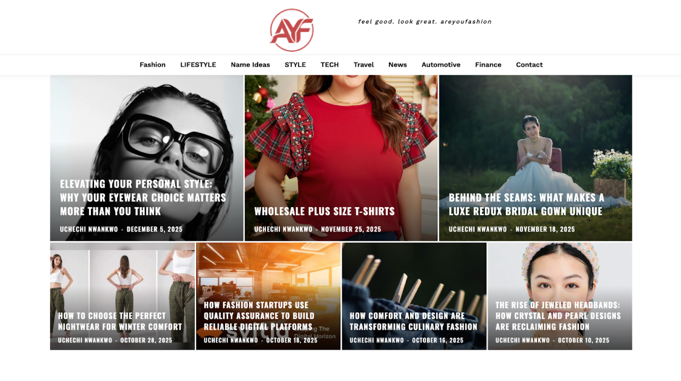 AreYouFashion.com presents itself as a fashion-forward lifestyle destination, but a closer inspection shows that it functions more as a general multi-topic content hub than a specialised fashion publication. While fashion and beauty remain central themes, the site also publishes articles on lifestyle, travel, technology, business, food, automotive topics, and basic finance.