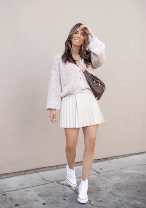 The tennis-inspired silhouette never disappoints. Choose a pleated white skirt, pair it with a pastel cardigan set, and finish with low-profile sneakers.