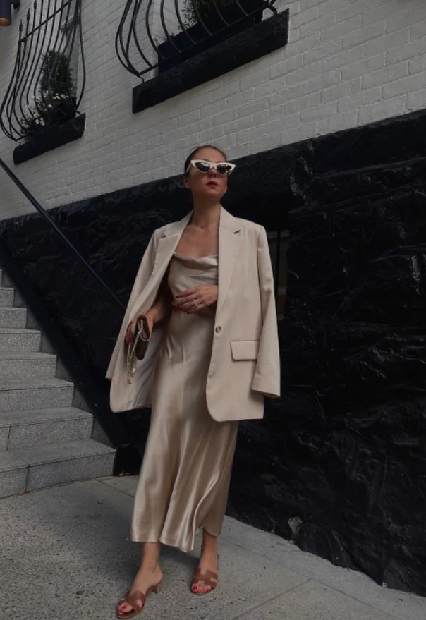 An oversized beige blazer layered over a satin slip dress transitions beautifully from day to dinner. Add delicate jewelry and ankle sandals.