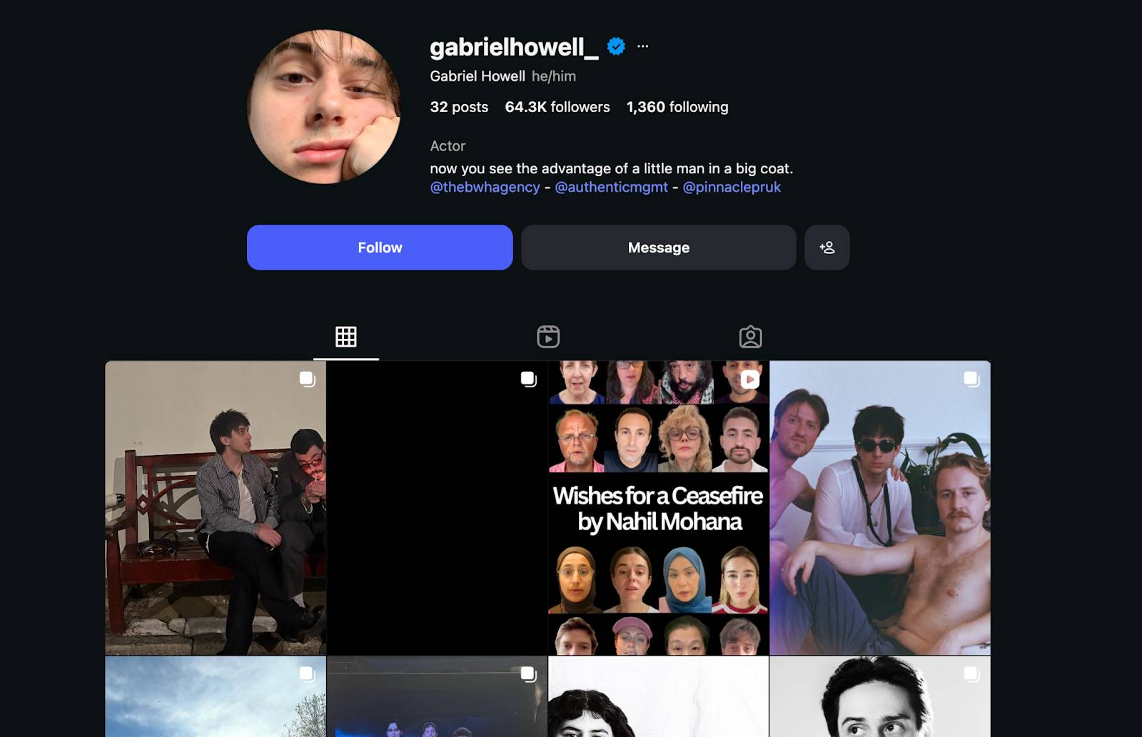 Gabriel Howell maintains a relatively low-intervention public image. His social media presence(Instagram) focuses on work, photography, and occasional political or humanitarian statements rather than lifestyle branding. There is little attempt to construct mystique or relatability as a product.
