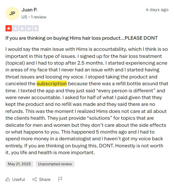 In terms of value for money, Hims ED meds are more affordable than most pharmacies, and hair products perform decently for mild-to-moderate hair loss cases.