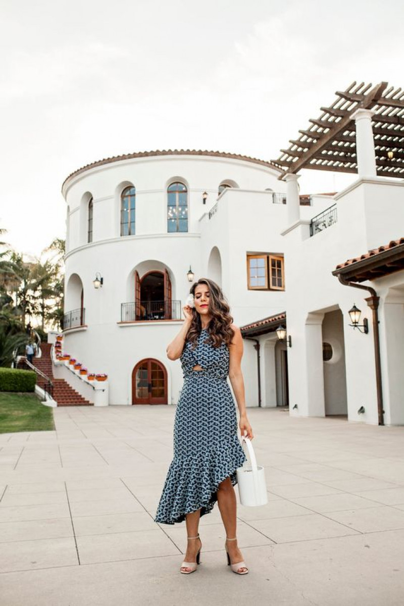 Knitted dress is a multicolor midi dress made of cotton. The bucket bag is white and made of leather. The formal sandals are beige and made of leather, with a chunky heel shape.