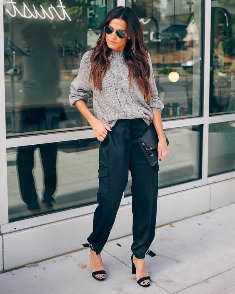 Go out with black long straight-fit Cargo trousers with a grey melange turtleneck sweater. Style the outfit with a black leather clutch and elegant chunky-heeled black sandals. Add sunglasses for a trendy touch.