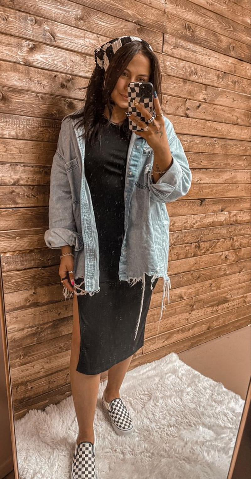 If we talk about trendy outfits, the light blue denim jacket with full button closure paired with long black skinny jeans. The white and black checkered van shoes complete the Trendy look.