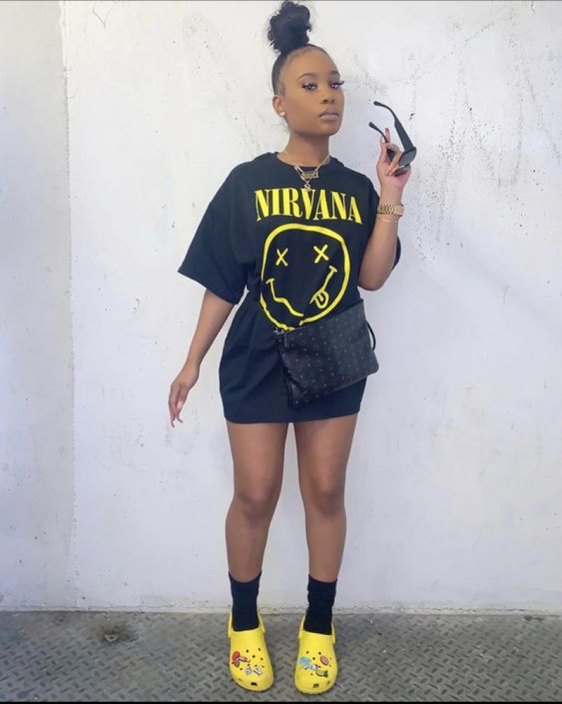 Must try this! pair a black denim hotpants with a yellow one-shoulder knitted top. Must try the outfit with gold earrings for a trendy touch.