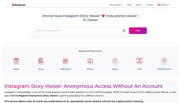 At its core Mollygram.com is a browser based viewer that displays public Instagram stories, highlights, reels, photos, videos, profile pictures, and older IGTV content. The tool retrieves media when a user enters a username or post URL and then delivers the assets in a clean isolated viewer.