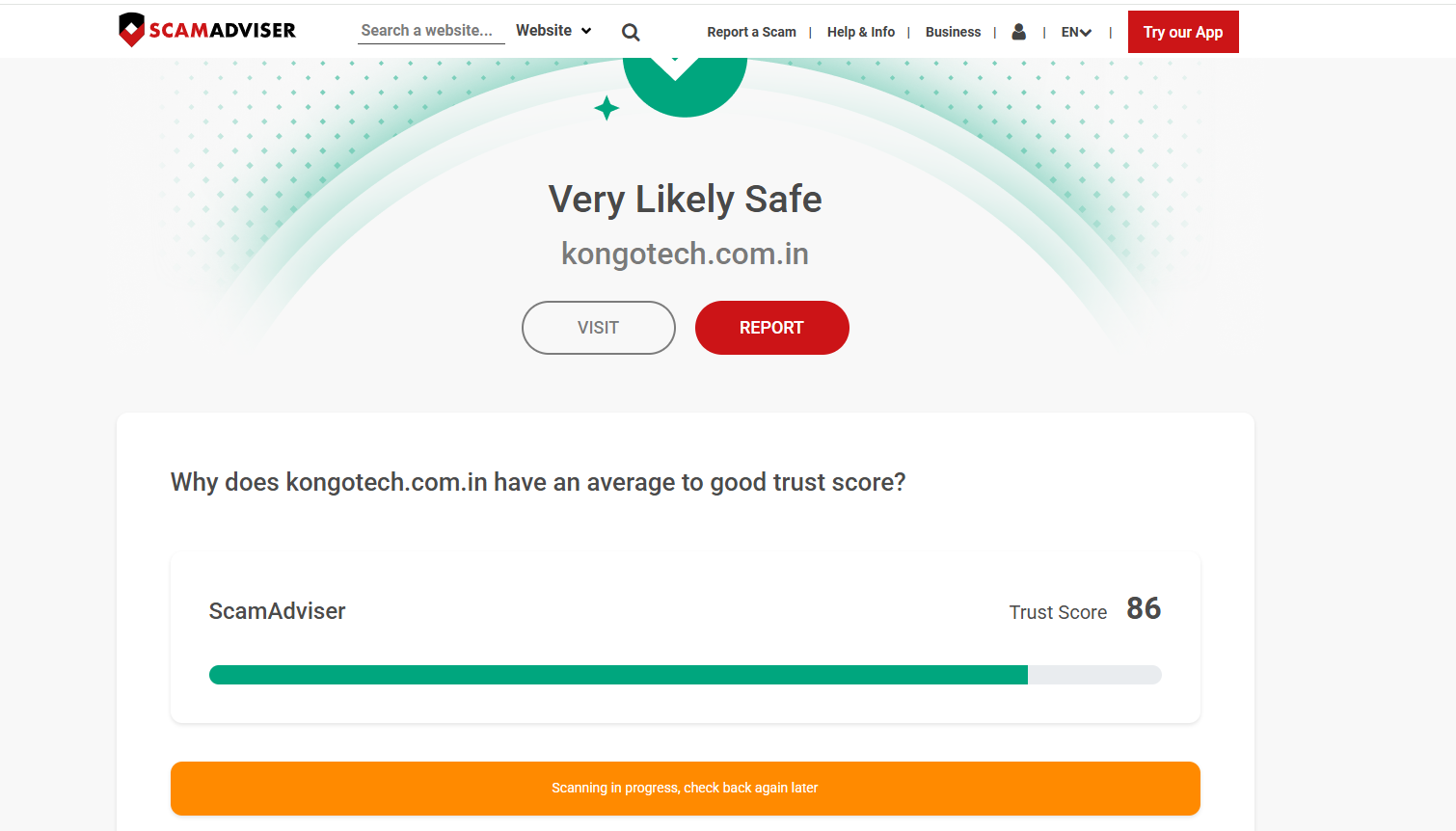 ● Scam‑check tools classify kongotech.com.in as “very likely not a scam” with a relatively high trust score based on age, traffic, and technical configuration.