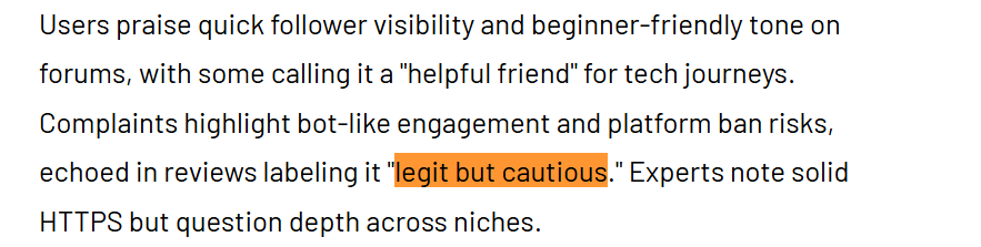 ● Some community voices describe it as “legit but cautious,” especially around any automated follower or growth shortcuts, where engagement may feel bot‑like and carry ban risk if misused.