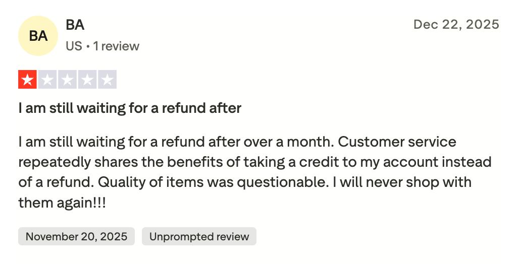 Refund handling is another major source of frustration. Some customers report long delays or difficulty receiving refunds, particularly when store credit is offered as an alternative. These experiences often escalate into one star reviews.