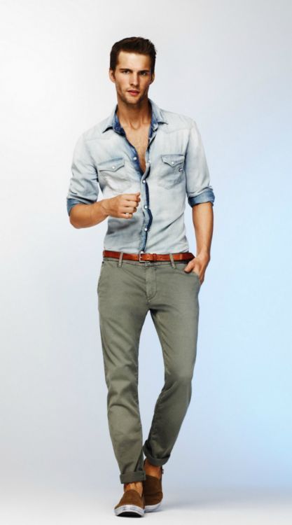Sky Blue Denim Shirt: A relaxed blue denim shirt with slim olive pants and sneakers for off-duty vibes or study sessions.