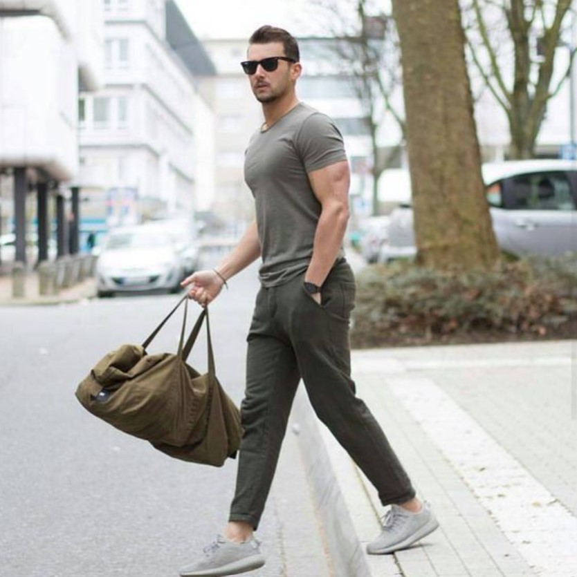 Grey Crewneck Tee: Ideal on warm days, slouchy grey tee, olive joggers, white trainers, and a crossbody bag.