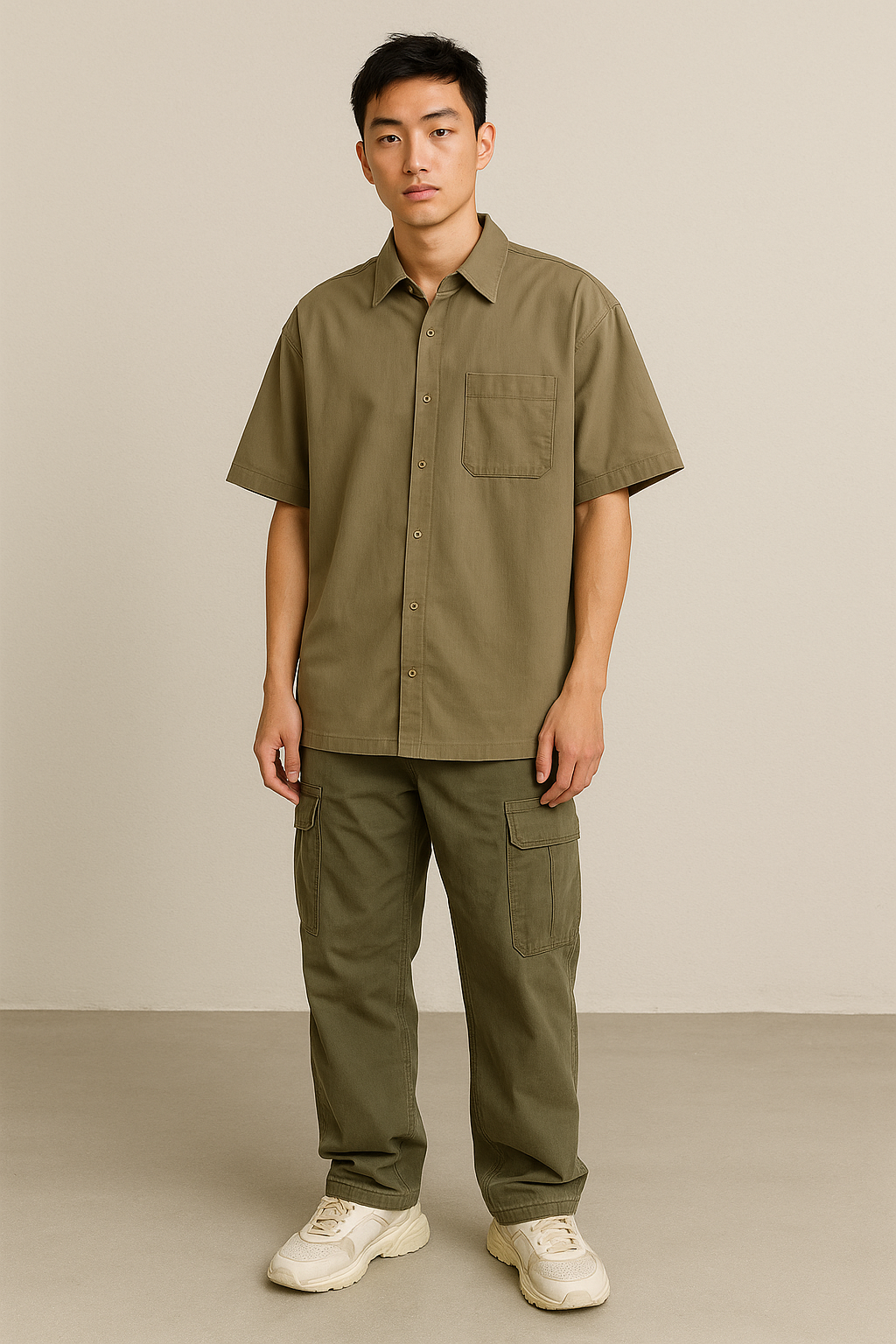 Patterned Shirt or Print Tee: Try a geometric or floral print that incorporates green or beige—tuck into olive pants, add white sneakers for effortless cool.