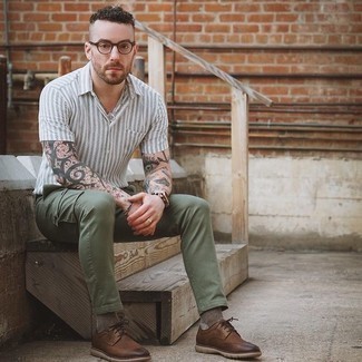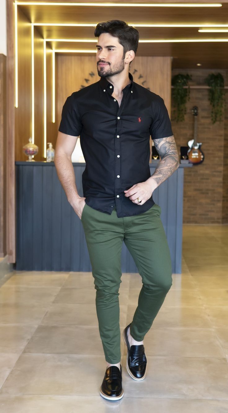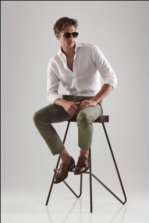 Crisp White Shirt & Olive Pants: Timeless for workdays or casual weekends. Choose a fitted cotton shirt, olive chinos, tan loafers, and a belt for polish.
