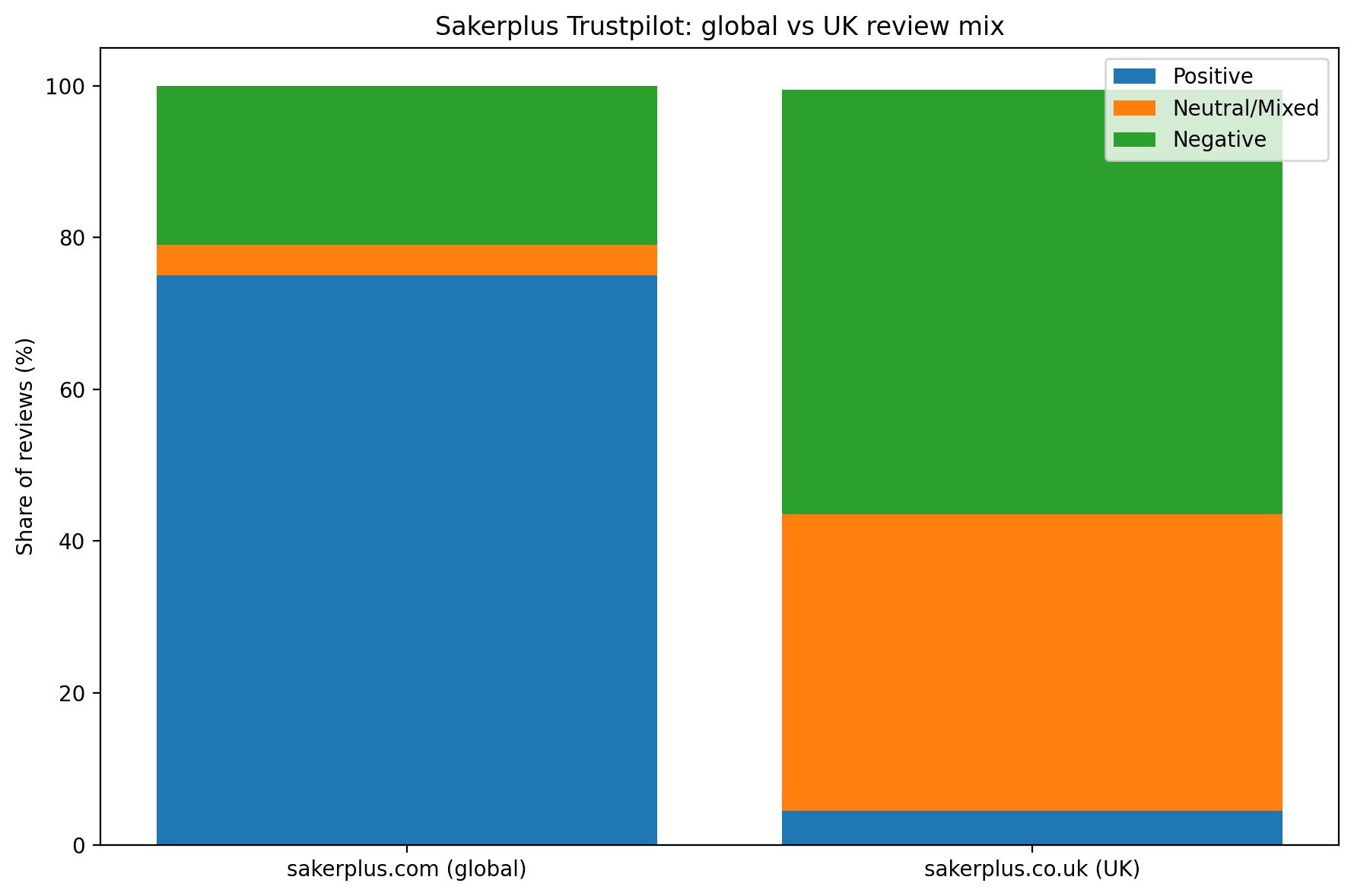 By contrast, the sakerplus.co.uk Trustpilot pages repeatedly state that “most reviewers were unhappy overall,” highlighting patterns of faulty items, missing parts, poor delivery, and unsatisfactory customer service. Even when individual reviews are positive, the aggregated sentiment tilts clearly negative for the UK site.