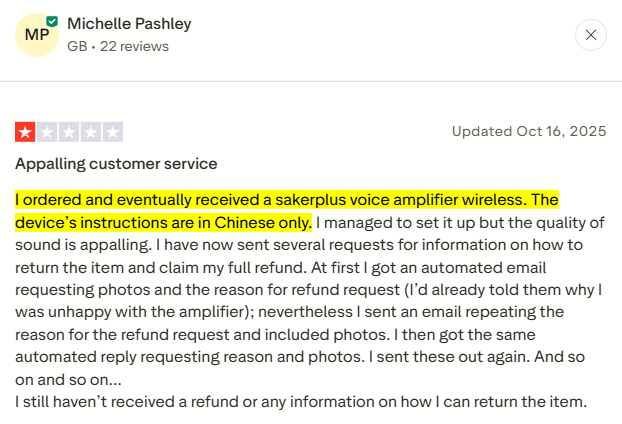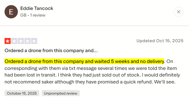 However, the UK‑focused sakerplus.co.uk presence is a significant red flag. Trustpilot’s AI summaries explicitly state that most reviewers there are unhappy overall, citing frequent issues with faulty products, missing parts, late deliveries, and unsatisfactory customer service. This level of consistent negativity makes Sakerplus a particularly risky choice for UK buyers or anyone whose order is routed through similar logistics chains.