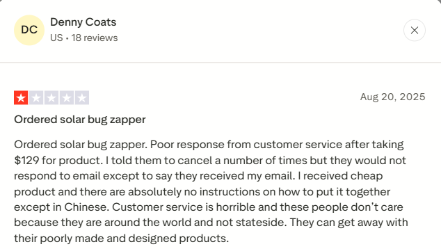 One negative example mentions a solar bug zapper that felt cheap, didn’t match expectations, and came with poor or non‑English instructions, leaving the buyer disappointed with both the product and the communication. Several reviewers explicitly use phrases like “not as advertised” or “waste of money” when describing their purchases.
