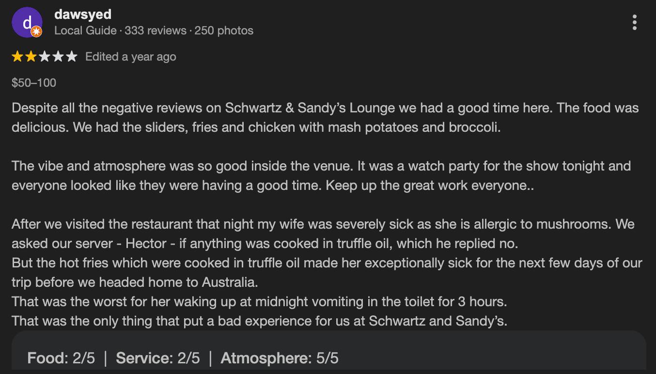 Yet behind the Bravo-fueled buzz, Schwartz & Sandy’s developed a reputation far more complicated than its neon-soaked interior suggested. Reviews from actual visitors reveal a business caught between spectacle and substance, where atmosphere often outperformed execution and expectations shaped by television rarely aligned with reality.
