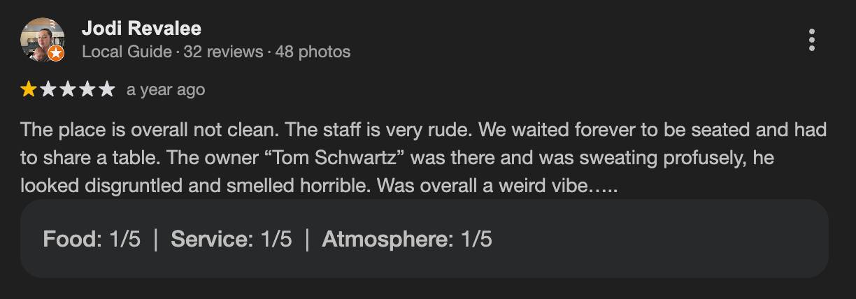 At the same time, a substantial group of reviewers felt the design worked against comfort. Lighting made menus hard to read. The room felt heavy rather than welcoming. Several guests said the space prioritized aesthetics over practicality, reinforcing the idea that Schwartz & Sandy’s was designed for cameras first and customers second.