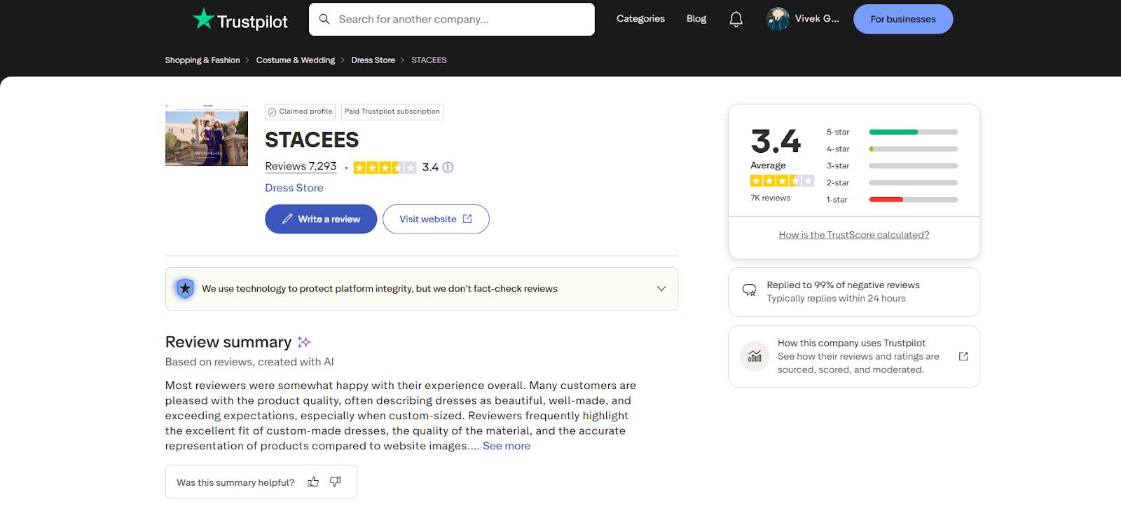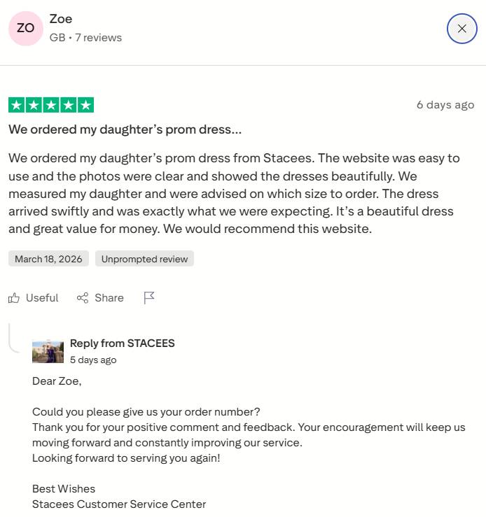 On Trustpilot, Stacees holds a relatively strong rating. Many customers praise dress appearance, delivery speed, and value for money.