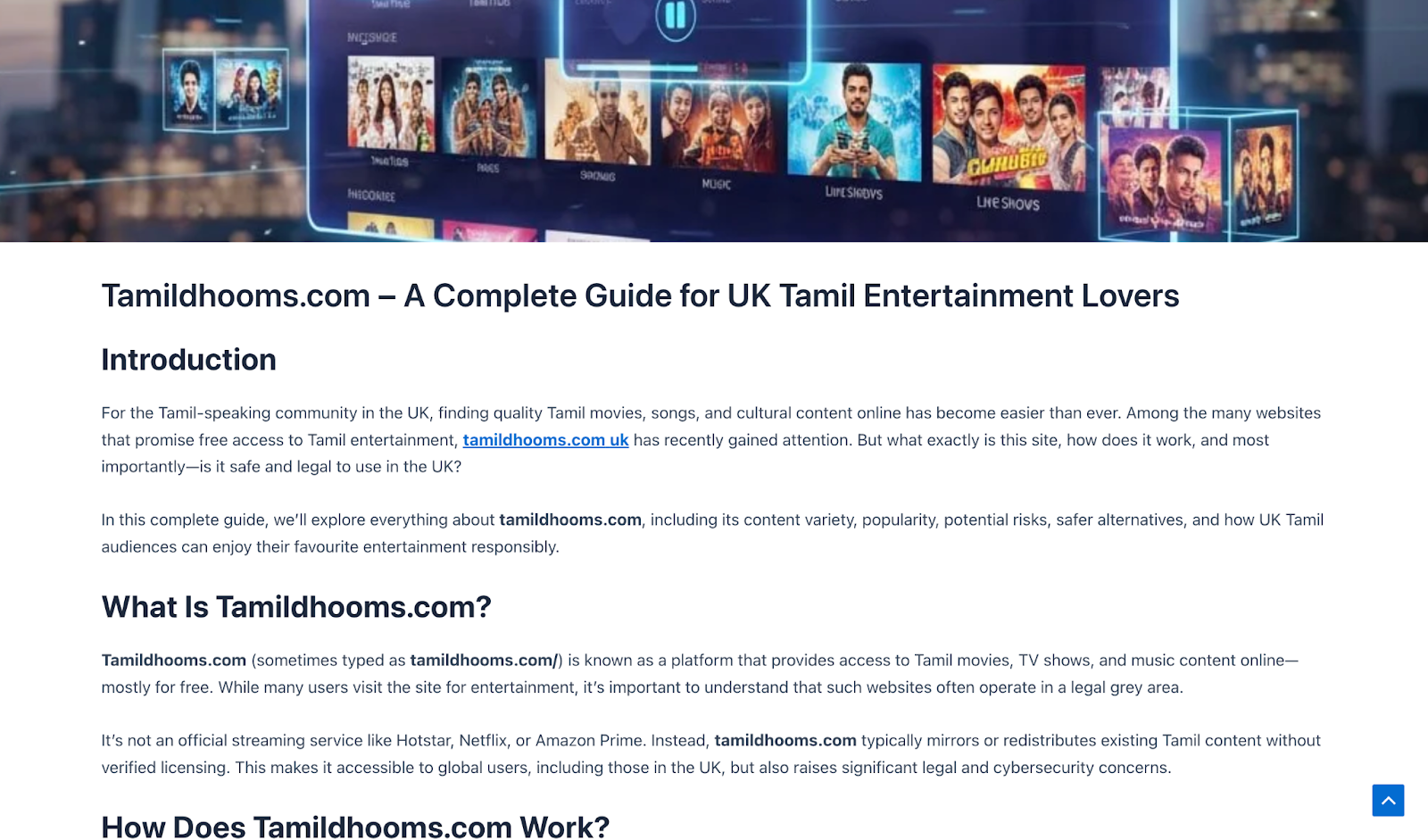 One of the most revealing aspects of Tamildhooms.com is the way it attempts to establish credibility. The site hosts a long, internally written article that explains its supposed role as a Tamil entertainment hub for UK audiences. The piece reads like an external review or guide, outlining what Tamil users should expect and why the platform matters.