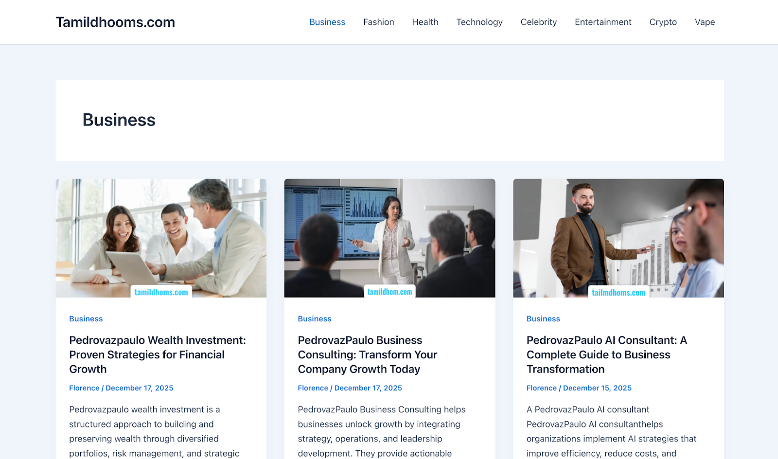 Instead, the site publishes content focused on business consulting, wealth management topics, marketing agencies, and recurring promotional profiles. The tonal shift is abrupt. These articles are written as generic informational or promotional pieces, bearing no relationship to Tamil entertainment or regional media.
