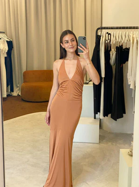 A modern favorite, the bronze halter slip dress radiates autumnal elegance with its shiny satin finish. Animal-print clutch and nude pumps take this look to earthy sophistication without losing fashion-forward edge.