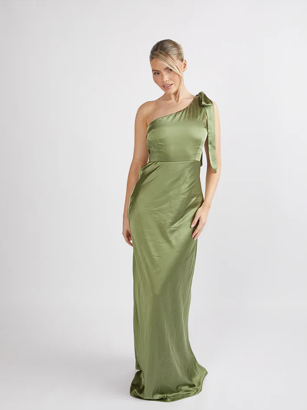 Nothing says fall like a moss green midi especially in a one-shoulder cut that highlights golden accessories. Block heels add comfort and strength to the silhouette, making it perfect for garden or barn settings.