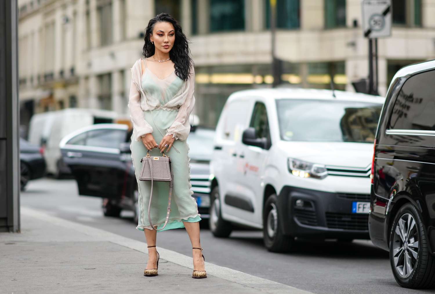 Try a cut-out satin mini dress in a bold tone (like moss green) and drape a sharp-shouldered white or neutral blazer on top. Pair with point-toe pumps for instant polish.