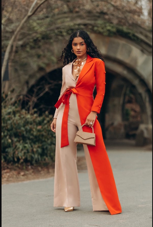 A sleek, wide-leg jumpsuit in navy or burnt orange feels fashion-forward paired with bold earrings and ankle-strap block heels. Add a box clutch for a modern finish.