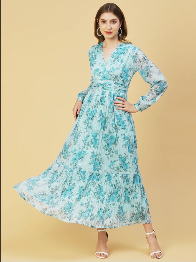 Florals or botanical prints on a flowy maxi dress look perfectly festive, especially with a ruffle detail or puffed sleeve. Keep jewelry understated and opt for a strappy low heel.